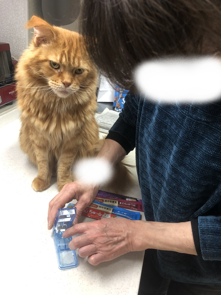 FIPの薬のひと粒が大きいため、ピルカッターでカットしている様子です。