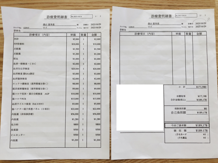 以下の写真は動物病院より頂いた診断書、診療費明細書となります。