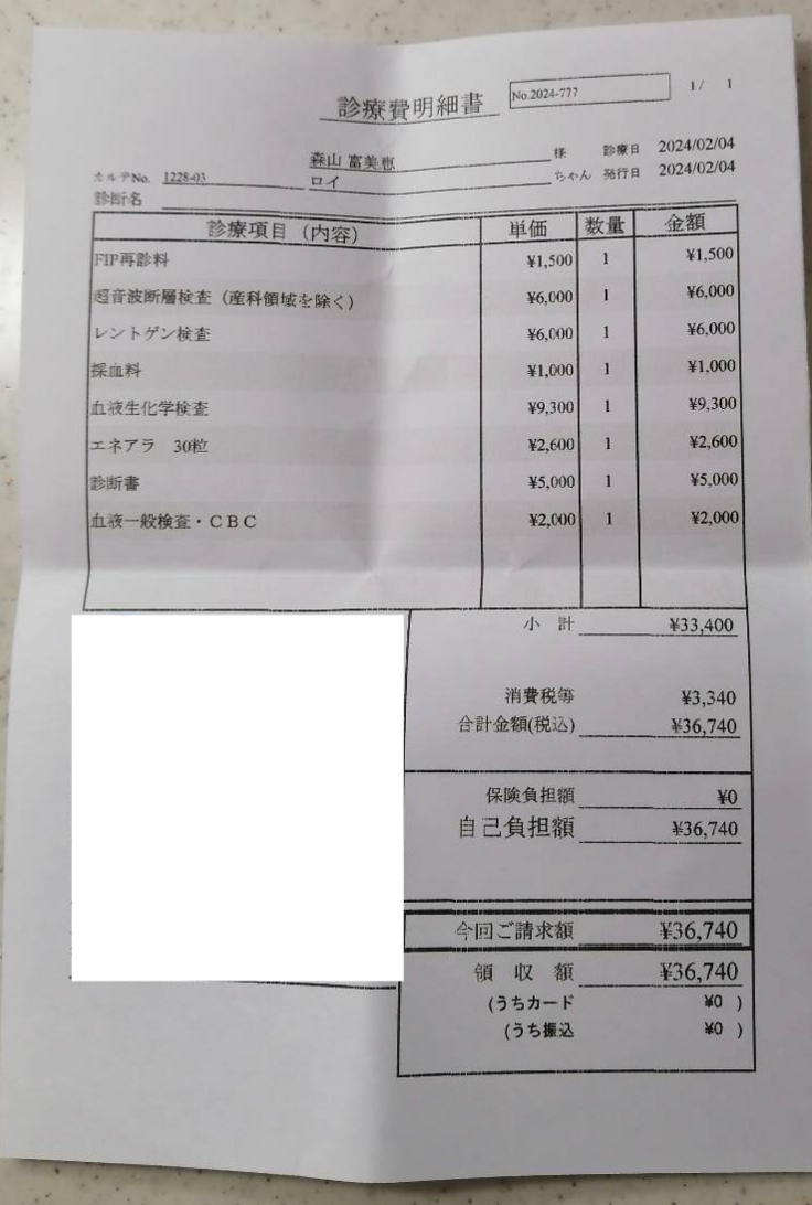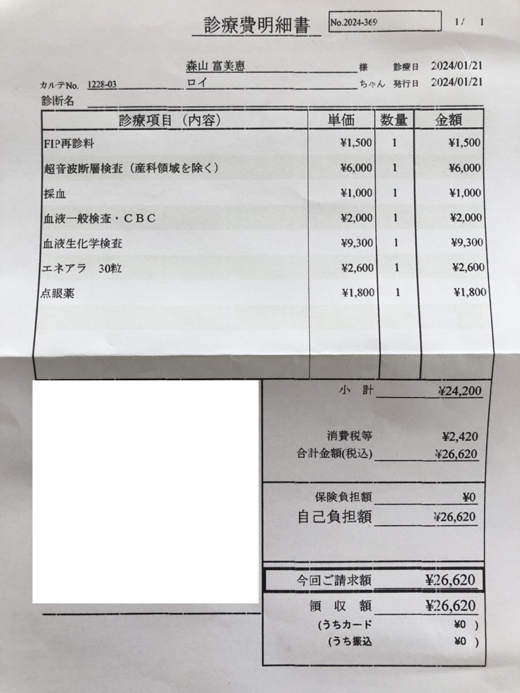 2024年1月21日時点でFIP治療薬の投薬が終わりましたが、さらに経過観察のため