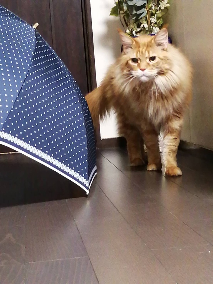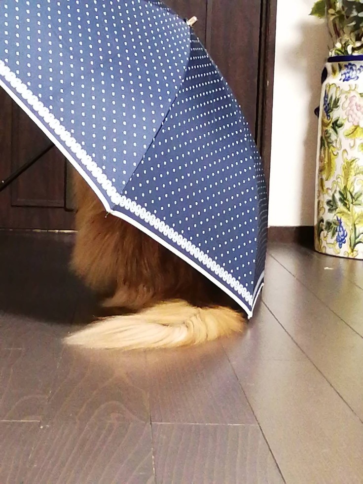 傘を干そうとしていたところ、気づくとオレンジ色のしっぽが見え隠れしています。