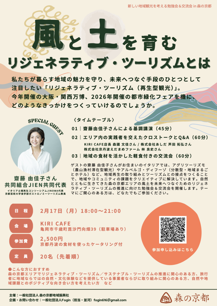 また、来月2月17日(月)にはイタリア・ピエモンテ州在住の齋藤由佳子さん(イタリア土壌再生コンソーシアムJINOWA代表 / 京都芸術大学食学部ガストロノミーツーリズム教員)をお招きして、リジェネラティブ・ツーリズム(再生型観光)を学ぶ勉強会&交流会を開催いたします。森の京都エリアにおいて同ツーリズムの推進にご関心のある方は、ぜひご参加いただけると嬉しいです。