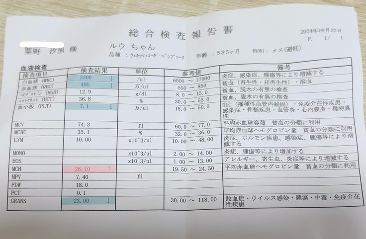 今日はうれしいこともあり、減っていた体重が少しずつ戻ってきていて、病院で測ったところリンパ腫になる前と同じ体重まで戻っていました!もともと小柄なため体重の減少をとても心配していたのでほっとしました。