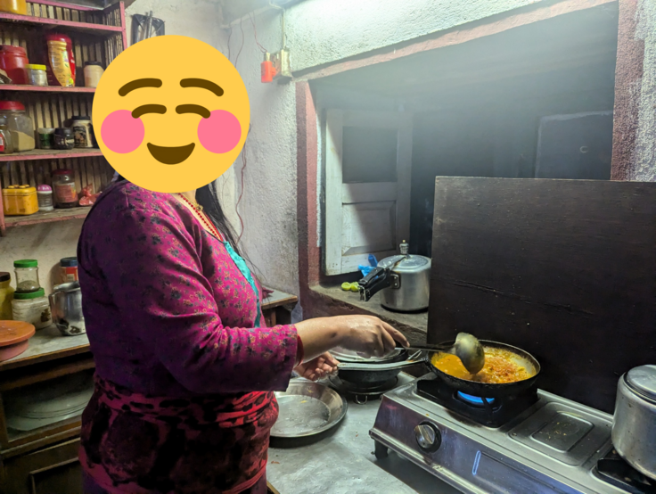 食べ進めていると、お母さんが鍋を持ってこちらにやってきました。おかわりを持ってきてくれたようです。ネパールでは、お店でもダルバートを頼むと全てのつけ合わせのおかわりを無料で盛りに来てくれました。以前ネットでも、大きなナンのおかわりを勧めてくれるネパール料理屋さんが話題になっていましたが、お腹いっぱい食べてほしいというネパール流のおもてなしなのでしょうか。
