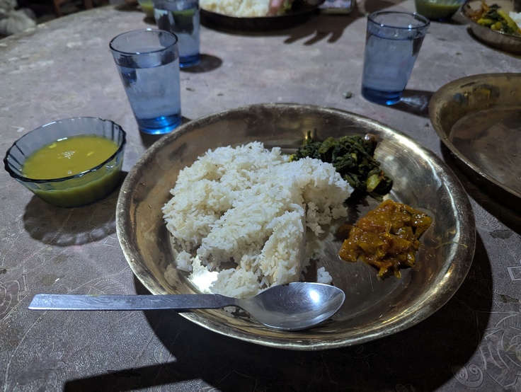 レレでのホームステイ中、朝と夜はホームステイ先のお母さんが手作りのごはんを振舞ってくれました。ネパールでの定番の食事は「ダルバート」というワンプレート。「ダル」が「豆」、「バート」が「ご飯」を意味する名前の通り、ご飯に豆スープの他、カレー、チキン、アチャール(漬物)などが添えられています。日本でいうご飯・味噌汁・焼き魚のような、ネパールではお馴染みのセットです。