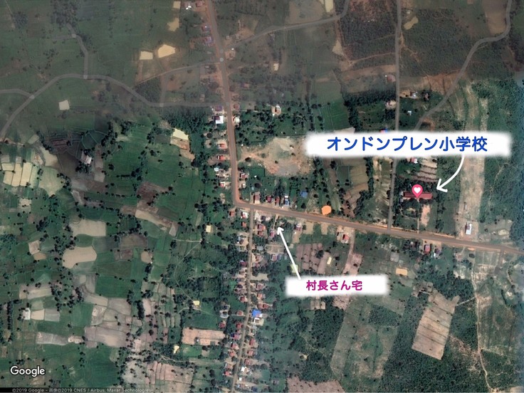 ハートのピンで示されているのが、私たちが今回トイレを設置するオンドンプレン小学校です!そして、小学校の近くにあるのが、私たちが毎年お世話になっている村長さんのご自宅になります。こちらの写真から、村の雰囲気を味わっていただきたいと思います!下のURLから、詳しいオンドンプレン村の地図をご覧いただくことができます。https://goo.gl/maps/6XV9PEnCcq8yR6Wc8