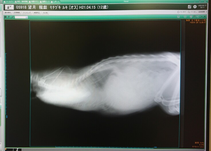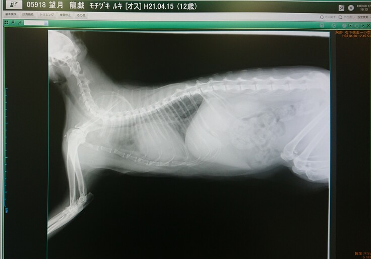 今年2021年1月27日、口を開けて息をしていることに気付き慌ててかかりつけの動物病院へ連れていった所レントゲンで撮った胴部は水で真っ白で胸水と腹水が溜まっていることが判明しました。