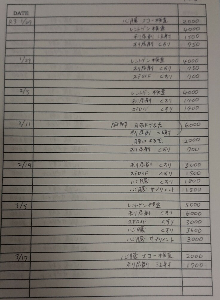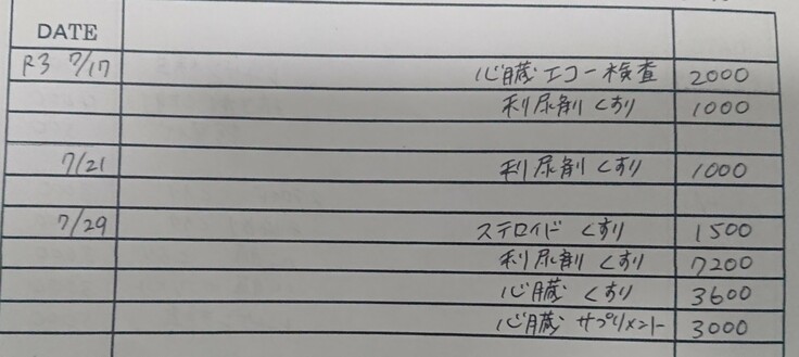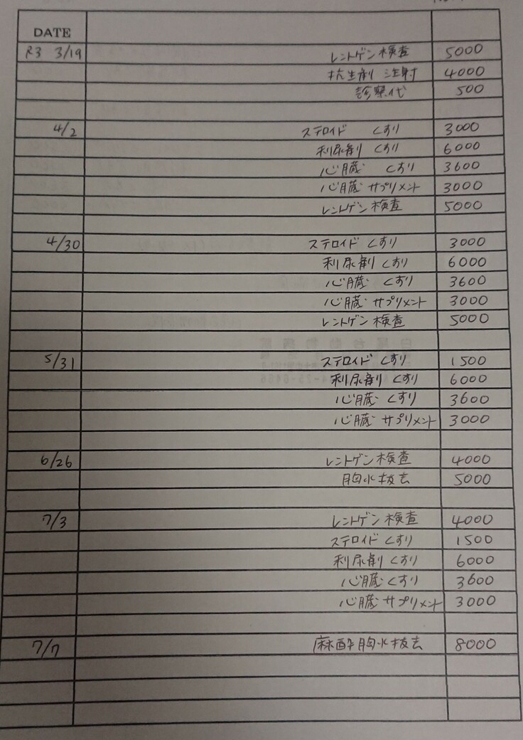 病院に行ってレントゲンやエコーを撮り、一ヶ月の薬を貰えばそれだけで21000円(薬代16000円+検査費5000円)ほどかかり、さらにまた水が溜まるようであればその都度水を抜く処置が1万円ほどかかります。通院が続いていたため正直病院には2ヵ月ほどの支払いを待ってもらっている状態です。