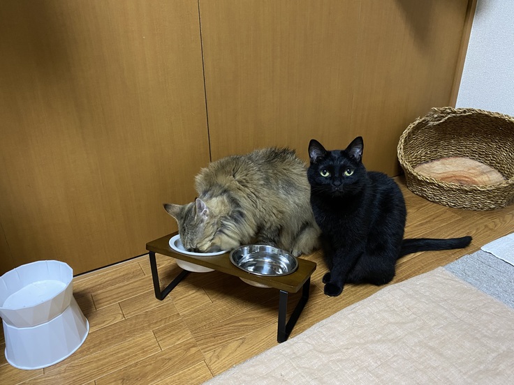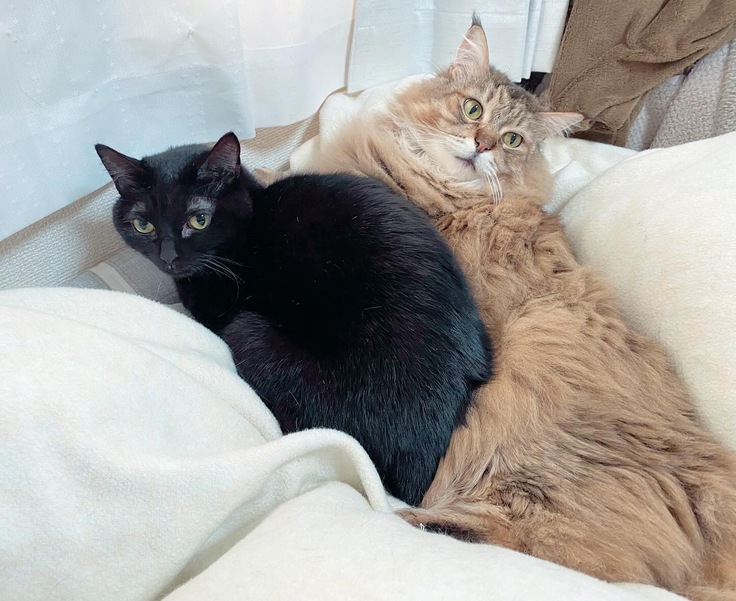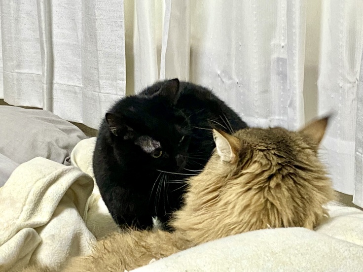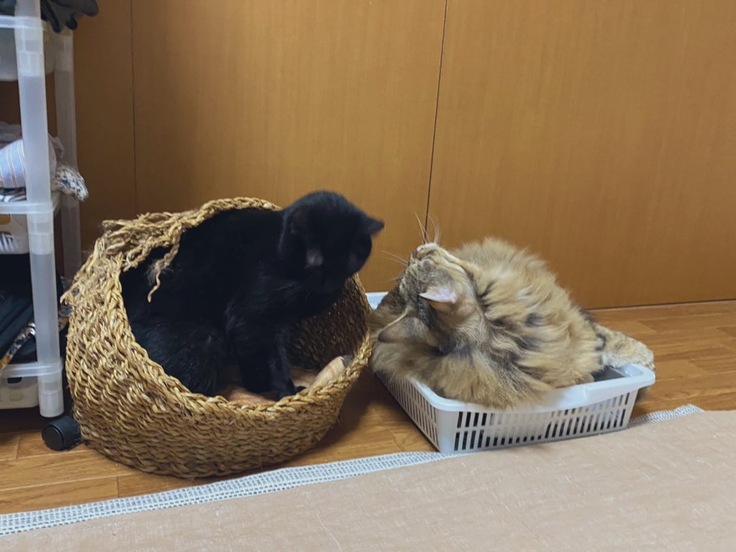 まだたねの警戒が完全にとけたわけではなさそうなのと、今は寒い時期ではないので2匹が密着することはないのですが、次の寒さがきた時は2匹が猫団子になっている姿が見れることを期待しています♪