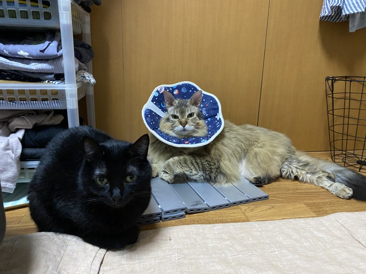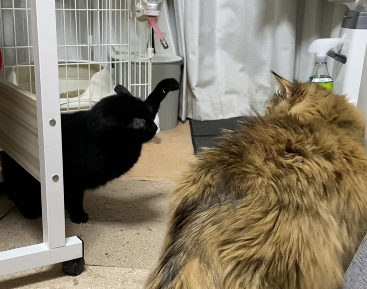 ですが、術後退院してからはまたルウの事を知らない猫扱いするようになっており、ルウが近づくと攻撃するので、どちらかが移動し始めたらたねがルウの頭を攻撃しないように私は常に身構えて、2匹が近づいたら間に入るようにしていました😰