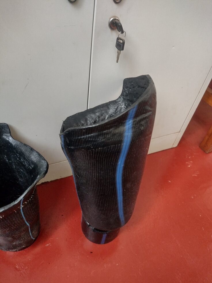足の切断した部分を入れるソケットというもの。日本であればこれは樹脂を固めて作るのだけど、ルワンダではその樹脂が手に入りにくい。例えば手に入ったとしても、いつしか市場からそれが全く消えてなくなってしまう、そしていつ入荷するかわからないというリスクがあるので、樹脂に頼りたくない。