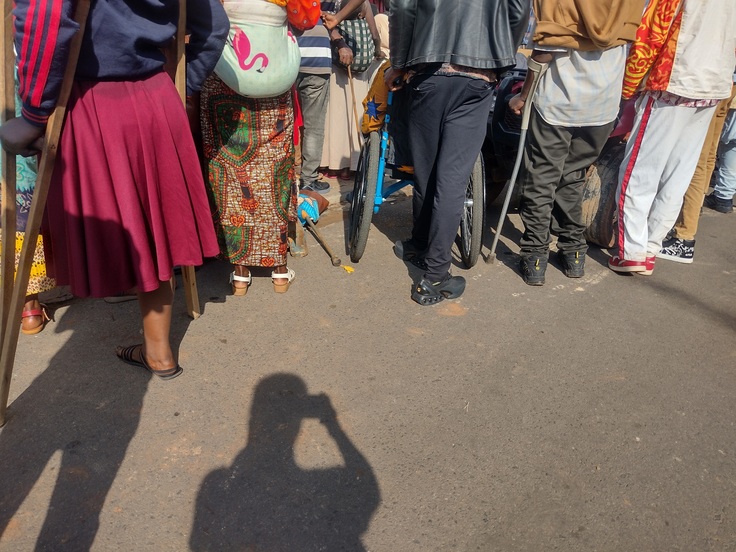 そして当日。朝5時過ぎ、朝の鳥が鳴き始める前に人も集まり始め、スタートの8時には団子状態になり、ちょうど朝の通学や通勤の車も通る時に、来るわ来るわ、障害者の皆さん。前日にテントを張ったが、既に入りきらない。そして足を切断した人だけでなく、とにかくいろんな障害の皆さん。