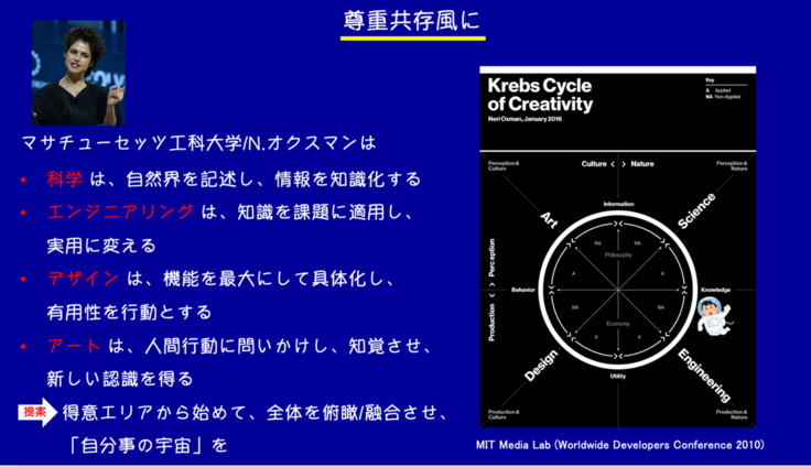 米国MIT大学で教鞭をとるN.オクスマン氏の論ですが、「サイエンス、エンジニアリング、デザイン、アートが一つのテーブルに乗る」ことが肝です。