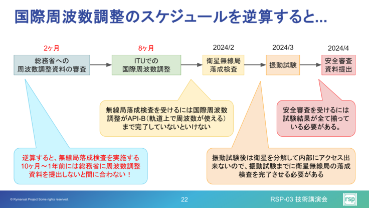 衛星の開発が決まったら打ち上げの2~3年前には申請を始める必要があります。