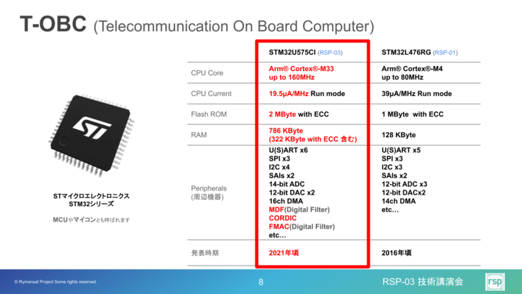前号機であるRSP-01で実績があるのはSTM32L476という別のOBCでしたが、コロナ禍の半導体不足で入手できなくなってしまっていたため、変更することになりました。より性能の高いマイコンです。
