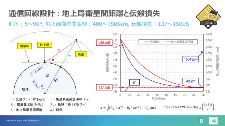 衛星と地上間で通信する距離はRSP-03の場合最長1805kmにもなります。その時の電波の減衰は150dB(約1/10^15)にもなります。