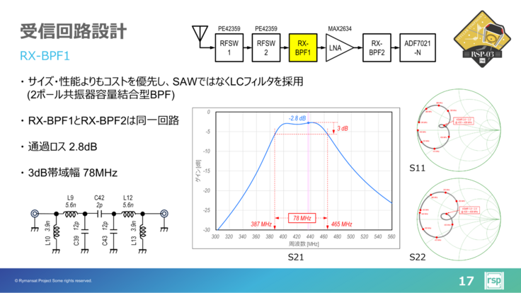 無線信号の送受信には、決められた周波数幅以外の不要な信号を除去するためのフィルタが不可欠です。RSP-03の通信系で実装した受信用BPF(バンドパス・フィルタ)や送信用LPF(ローパス・フィルタ)の設計についても解説がありました。