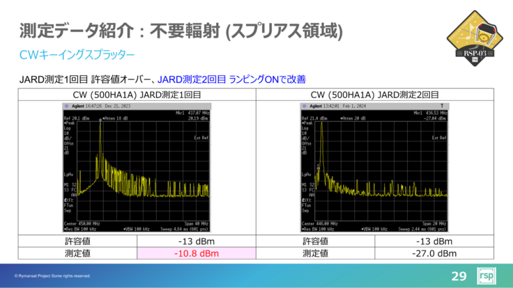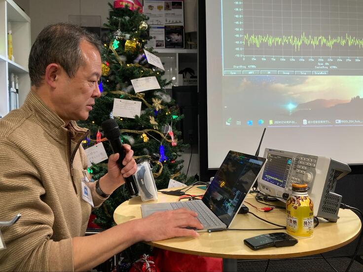 実演パートではRSP-03に搭載した無線機のEM(エンジニアリングモデル:試作品)とスペクトラムアナライザを使ったデモがありました。パソコンからRSP-03無線機にコマンドを送り、無線機から送信された電波のスペクトラムを確認しました。