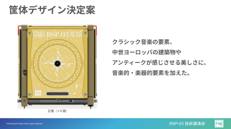 RSP-03は、趣味の団体として+X面をデザインのためにあけ、「星を音楽にして地上に届ける」というミッションを、デザインで表現することを試みています。