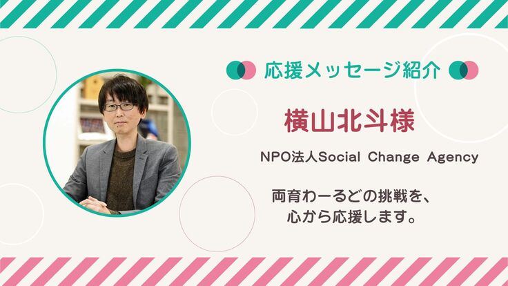 制度の狭間にいる難病者の社会参加を支援する両育わーるどの挑戦を、心から応援します。働く意思があるにも関わらず、制度の壁により働くことができない難病の方が多い現状を変えるためのこの活動は、難病の方だけではない、子育てや親の介護などのケアによって働くことに制約がある人、そのほか、誰もが働きやすい職場・社会づくりにつながると考えています。