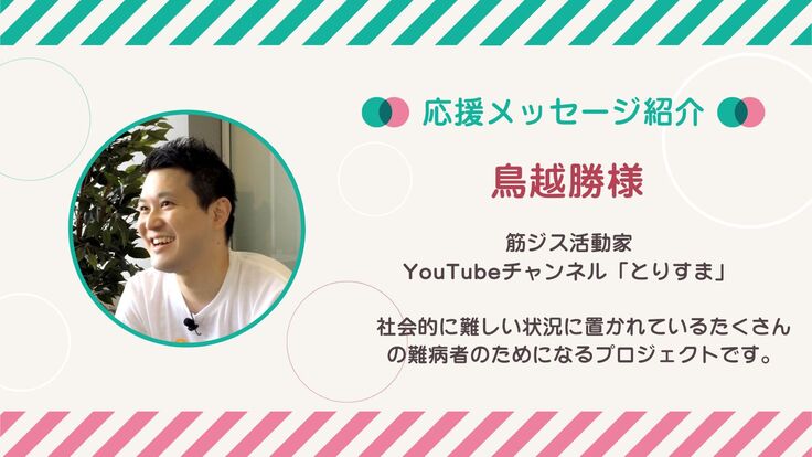 僕自身もベッカー型筋ジストロフィーという難病の当事者であり、働き方を理由に退職をした経験があります。より柔軟な働き方ができていれば就労を続けられていたかもしれません。難病者の社会参加白書にはそうした可能性を広げるために必要な情報が詰まっており、このプロジェクトによってより多くの方に届けることができれば社会が変わっていくキッカケになるはずです。社会的に難しい状況に置かれているたくさんの難病者のためになるプロジェクトですので、ぜひみなさんもご支援してください!!よろしくお願いします!