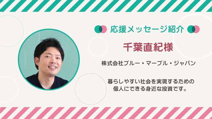 難病をはじめ世の中から理解されない苦しみは多くあると思います。今回の白書は、それらの困難を可視化していき、社会に知ってもらうための重要なきっかけになると信じています。病気や障害があっても働きやすい個々の環境を作っていくことは、健常者の働きやすさにもつながりますし、よい会社を増やしていくことにもつながると思います。本プロジェクトへの関わりは、暮らしやすい社会を実現するための個人ににできる身近な投資だと捉えています。応援しています!