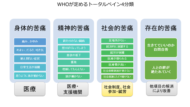WHOによると痛みは4つに分類されます。痛みやかゆみ、めまい、だるさなどの絶え間ない症状などの「身体的苦痛」。いつ治るか分からない、怒りっぽくなってしまうなどの「精神的苦痛」。役割がない、生活に困窮するといった「社会的苦痛」。このまま生きていて意味はあるのだろうか、といった「存在的苦痛」です。これらの4分類に、これまでにやりとりをしてきた数百人の同病者や、線維筋痛症、筋痛性脳脊髄炎・慢性疲労症候群などの類似疾患の方々の当事者の声を当てはめると、次のようにまとまりました。