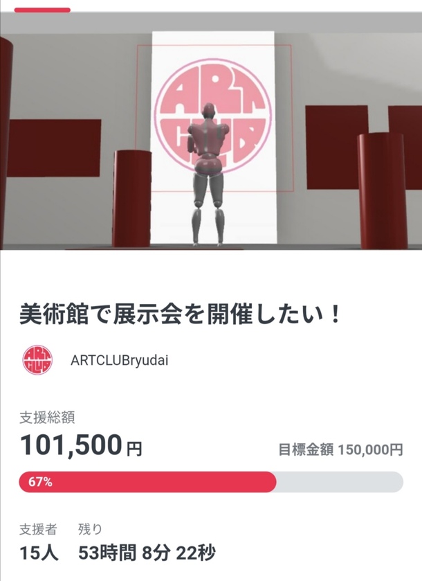 ![美術館に作品展示体験(作品サイズ 600 × 600 [mm] まで)](https://readyfor.jp/rails/active_storage/representations/proxy/eyJfcmFpbHMiOnsibWVzc2FnZSI6IkJBaHBBNU9EQXc9PSIsImV4cCI6bnVsbCwicHVyIjoiYmxvYl9pZCJ9fQ==--7f2840e00374b58fd412ac39a88903c6ccc8f8b4/eyJfcmFpbHMiOnsibWVzc2FnZSI6IkJBaDdDRG9MWm05eWJXRjBPZ2wzWldKd09oTnlaWE5wZW1WZmRHOWZabWxzYkZzSGFRSXNCR2tDbEFJNkNuTmhkbVZ5ZXdZNkRIRjFZV3hwZEhscGFRPT0iLCJleHAiOm51bGwsInB1ciI6InZhcmlhdGlvbiJ9fQ==--fc2618279d5c256a3dee5442678918f2b9145a45/p62086-r179038-visual.jpeg)