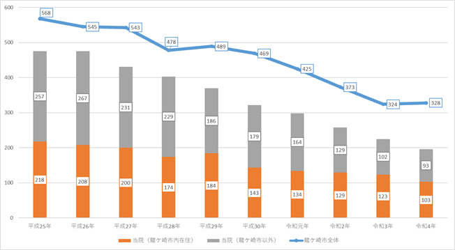 しかし、龍ケ崎市自体の人口流出の影響も後押しして出産件数は年々右肩下がりとなっています(※図2)。