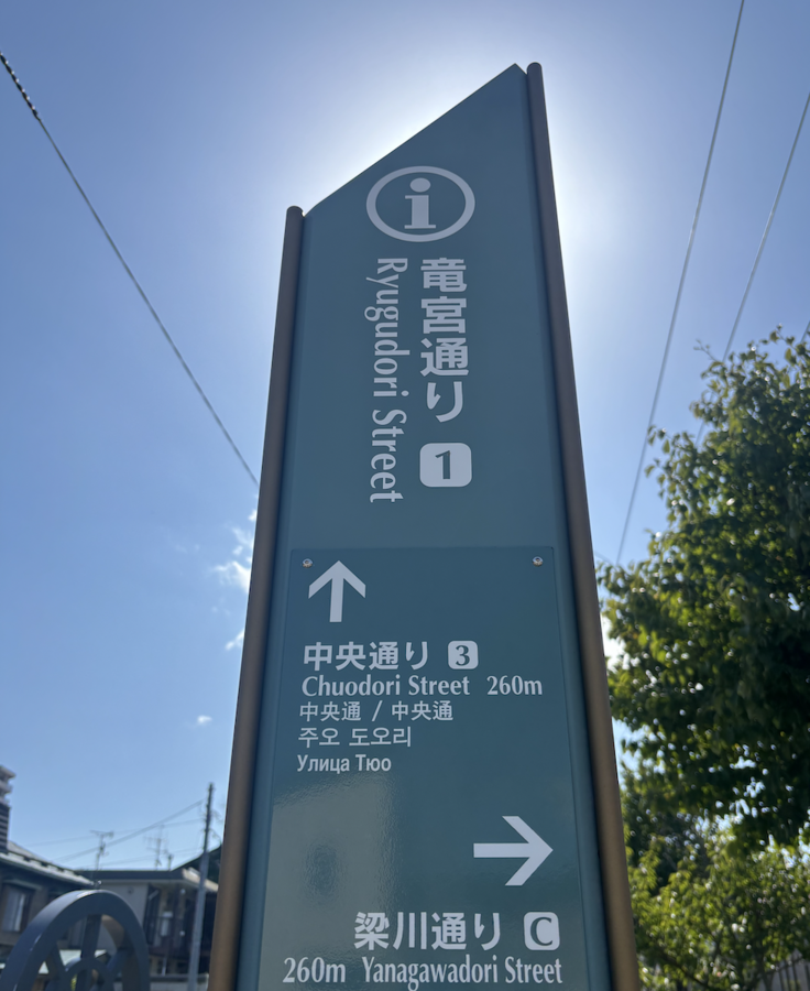この旧手宮線跡では、直交し龍宮神社から龍宮橋を越えて小樽湾へと繋がる通りが『龍宮通り』であると示してくれます。
