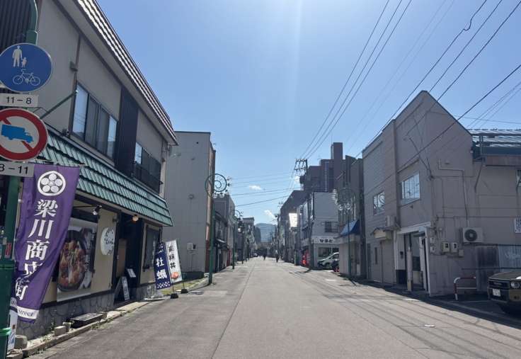 小樽駅近くにあり、駅前通りを挟んで龍宮神社側が「柳川通り」、札幌側が「都通り」となります。
