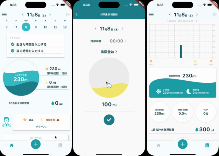 (左:日毎の入力画面 中央:尿量入力画面 右:入力項目のまとめ画面)