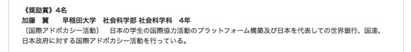 この大学4年間、ボストンへの留学を含めると5年間の活動は、日本学生支援機構にも評価され、大変光栄なことに今年の優秀学生顕彰の社会貢献部門で奨励賞を頂きました。