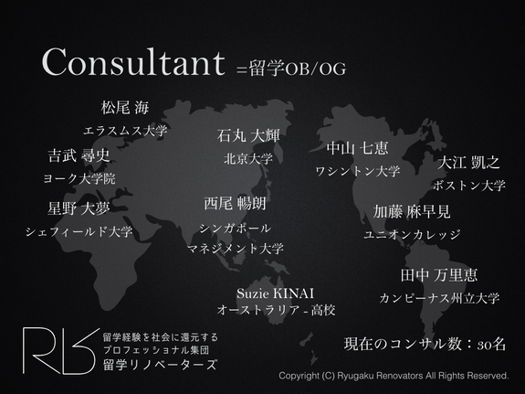 現時点で運営を担うパートナーが6人、登録制で必要に応じてコンサルティングを担当するコンサルタントが国内、海外含んで既に世界に30人います。その国もアメリカ、イギリスから、ブラジル、マレーシア、アフリカまで多岐に渡ります。今後私たちは世界中に登録コンサルタントを増やしていく予定です。コンサルタントそれぞれのメッセージはFacebookページよりご覧になれます。