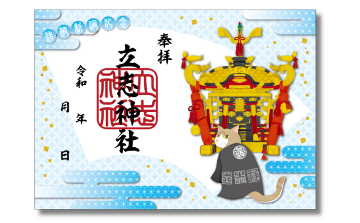 御神輿と新調する法被がご朱印の中で表現されており、法被を羽織っているのは、境内によく遊びに来てくれるネコのみーちゃんを描いています。
