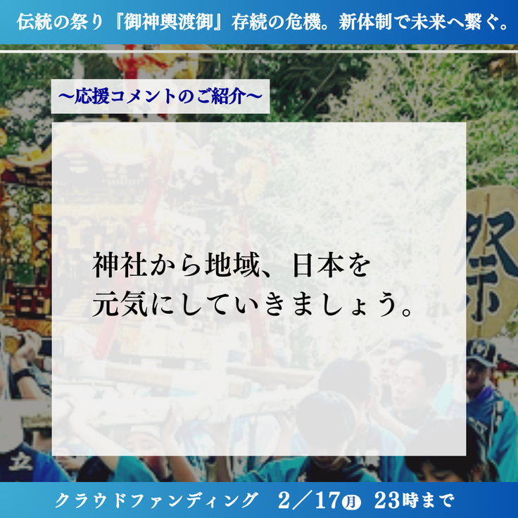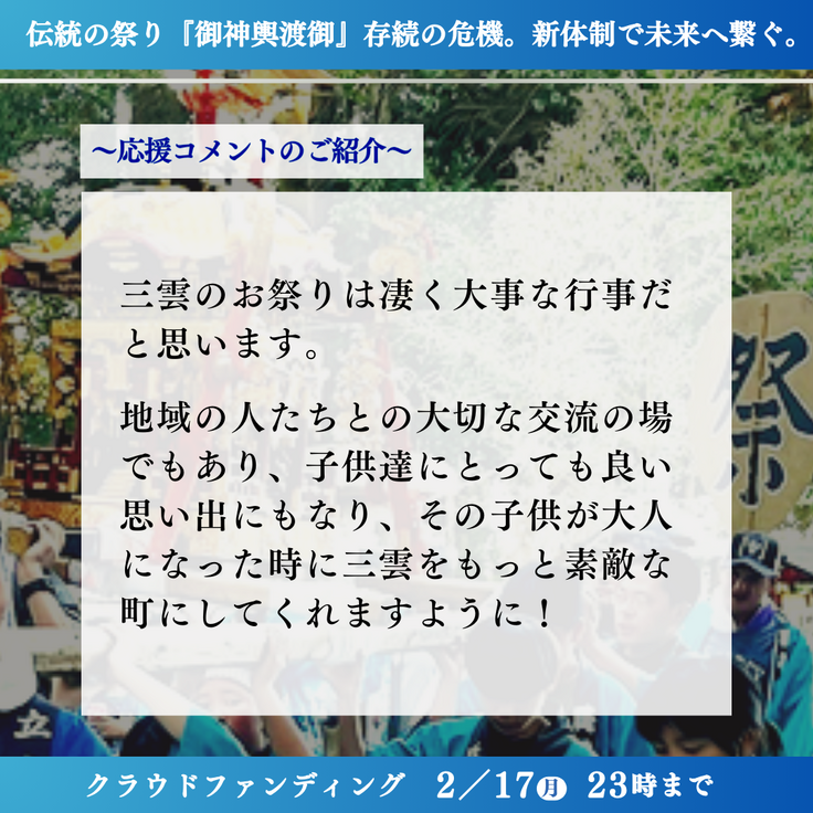 さらに高い目標として、この御神輿渡御を通じて、地域絆をこれまで以上に深め、子どもたちの心に残る思い出をつくり出せるよう御神輿の装飾品として『三雲まつり』を象徴する提灯を新しく作りたいと考えています!