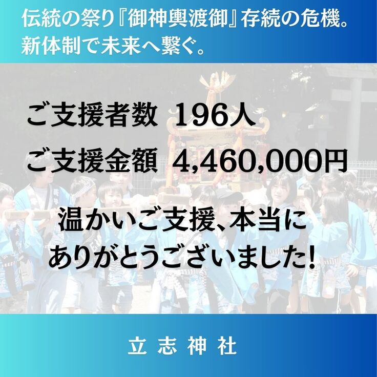 立志神社のクラウドファンディング「伝統の祭り『御神輿渡御』存続の危機。新体制で未来へ繋ぐ。」へ、想像を遥かに超える温かいご支援を賜り、誠にありがとうございました!