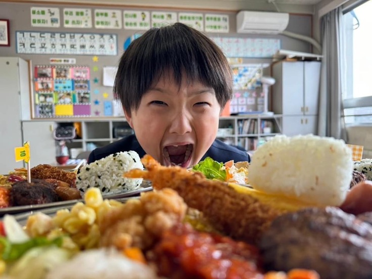 ハンバーグや、エビフライ、フライドポテト、ウィンナー、おにぎり、クロワッサン、ワカメスープに、デザートのオンパレードでした!
