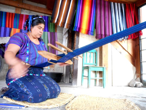ブルーの民族衣装が鮮やかな、手織物が盛んな村。