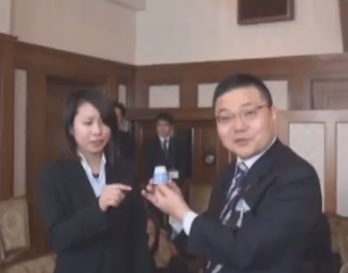 写真は佐賀県海外使節団の記念品である有田焼のぐい呑みをPRする上田さん。