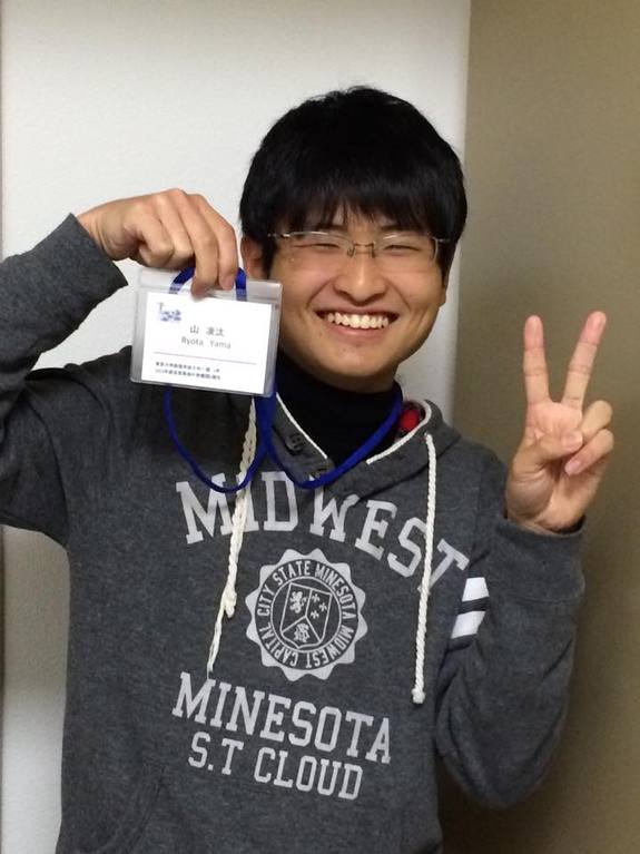 使節団のネームタグを手に満面の笑みの山くんです。