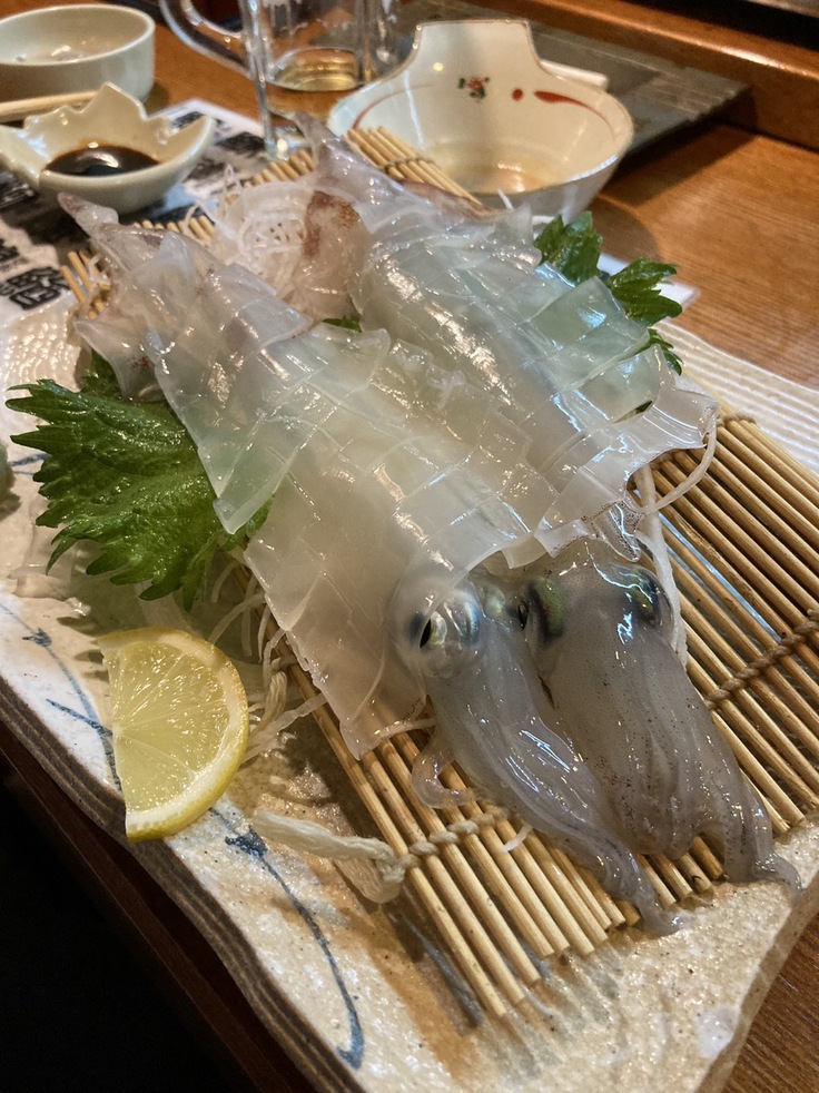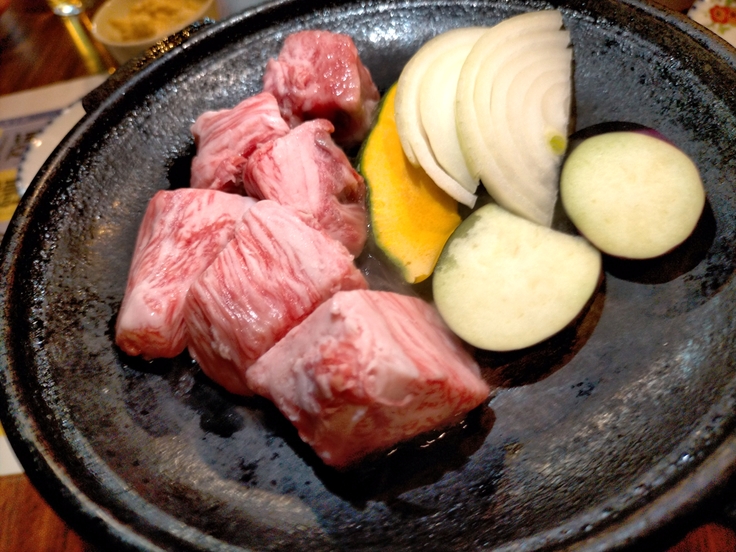 佐賀牛のサイコロステーキは鉄板で自分で焼き具合を調整して食べることができ、かるく表面に焼き色がついた頃に口に含むとトロッと脂がとろける食感を味わうことができるのでおススメです。また、呼子イカは刺身にして身を食べた後、足の部分を天ぷらか塩焼きにすることができるので、1回の注文で2度楽しむことができます。