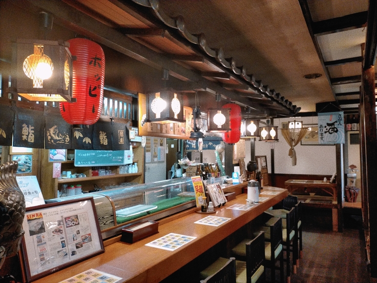 そんな悠々と泳いでいる魚たちに迎えられ右手に進むと和風のカウンター席とテーブル席が見えてきます。カウンター席にはフグ提灯、テーブル席の長押には大きな魚拓が飾られており、まさに海鮮居酒屋という名前にピッタリの雰囲気です。