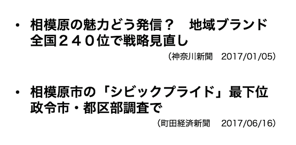 「相模原市の「シビックプライド」最下位 政令市・都区部調査で(町田経済新聞 2017/06/16)」