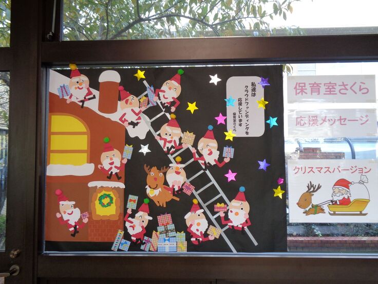 今回は、たくさんのサンタクロースが飾り付けられたクリスマスバージョンの応援メッセージです。個性ゆたかなサンタクロースたちは園児さんの手作りです。