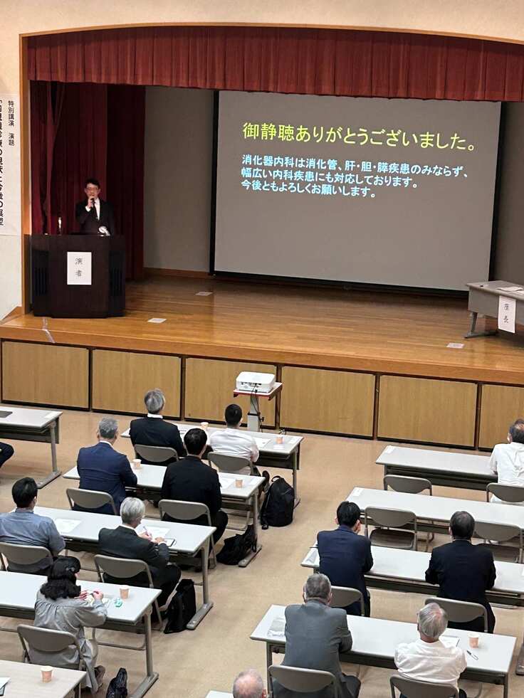講演会では、当院の城戸医療部長(消化器内科)や山口消化器内科主任医長の講演や広島大学大学院 医系科学研究科 消化器内科学の岡教授にお越し願い、最先端の内視鏡検査・治療に係る大変有意義な講演を賜りました。