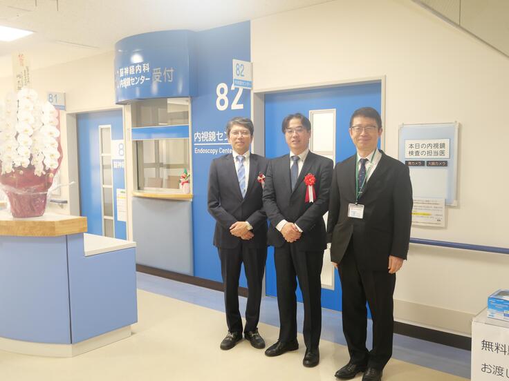 ※内視鏡センター受付前の写真の中央は広島大学大学院の岡教授、左は当院の松本院長、右は城戸医療部長です