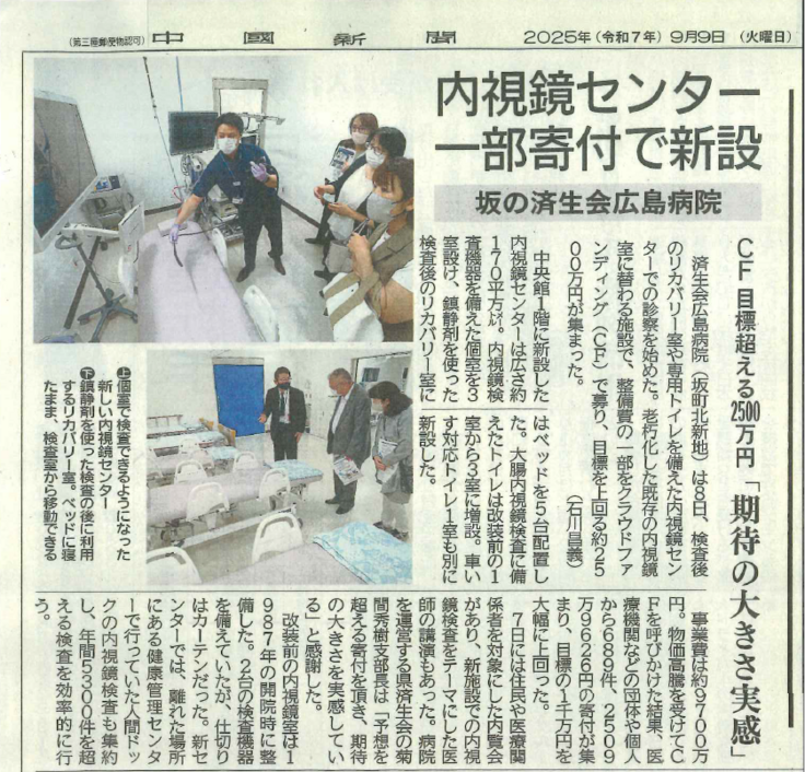 また、内視鏡センターの開設については、開設の翌日の中国新聞にも掲載されました。