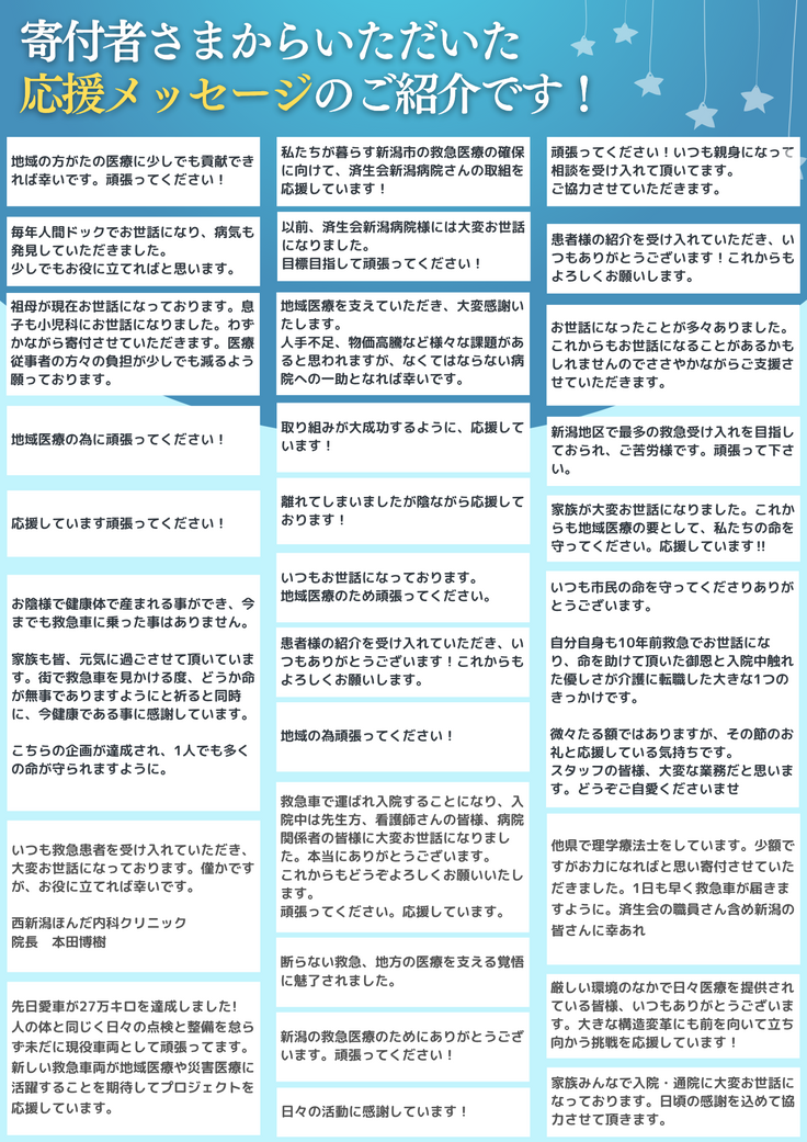 いつも温かいご寄付をいただき、誠にありがとうございます。新潟の地域医療を守る救急車更新プロジェクトも、いよいよ残り4日となりました。皆様からの温かい応援が、現場で働く医師や看護師、職員の大きな励みとなっています。