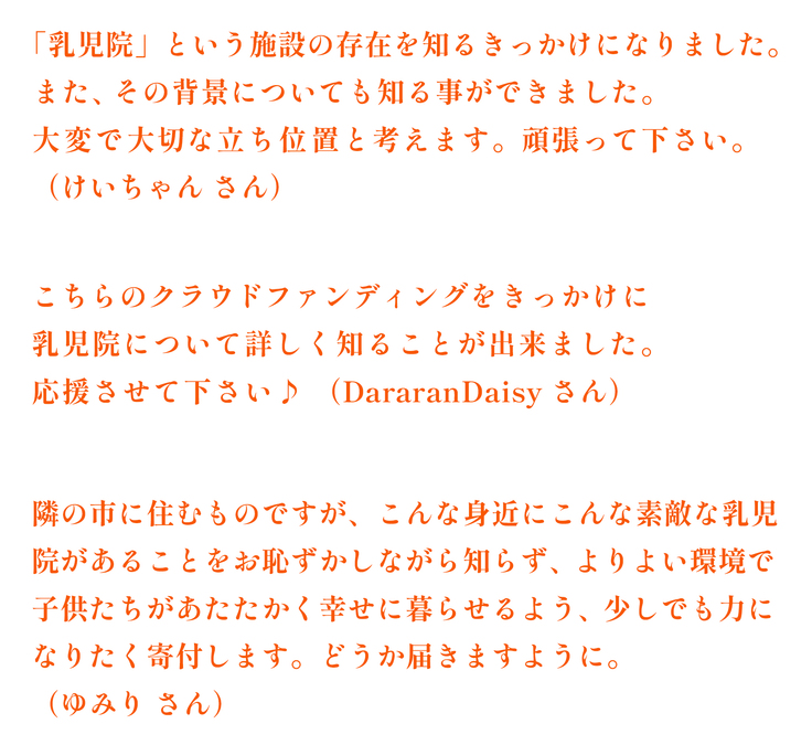 今回の取り組みを通して、多くの方に「乳児院」のことを知っていただけたことも、本当にうれしく思っています。
