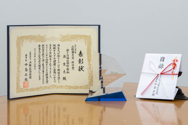 歴代の済生丸(一世号、二世号、三世号、100)の累計活動実績(1962年12月~2024年3月)は、診療島嶼延数13,249島、受診延人員627,441人であり、地域への貢献は計り知れない。海事交通文化を体現し、長期にわたり社会に貢献した功績は山縣勝見賞(特別賞)にふさわしいものであるとして、長年の社会貢献を評価いただきました。